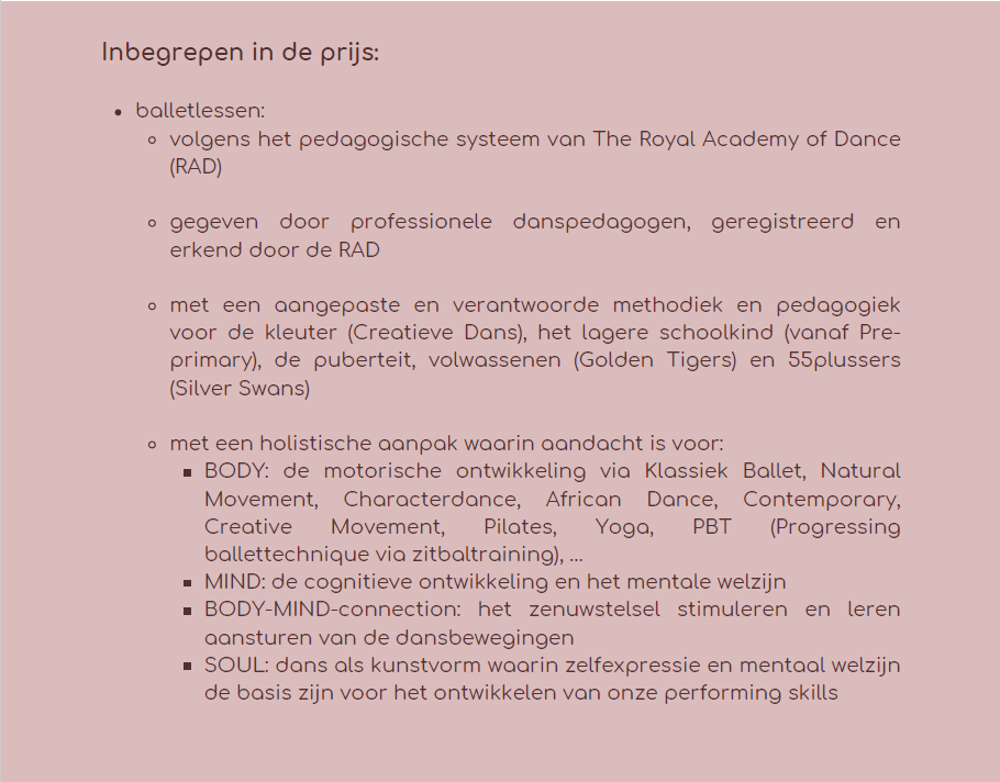 Balletles volgen bij Dance Images omvat veel meer dan de balletles op zich. Daarom werken we met waardepakketten per niveau. Je kan kiezen voor een waardepakket: