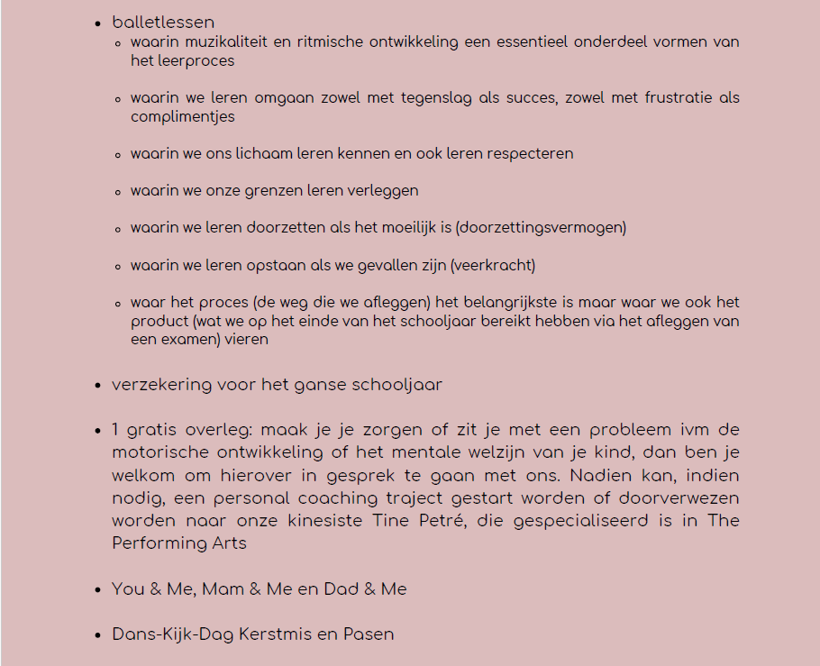 Onze balletlessen zijn meer dan enkel dansend bewegen op muziek. Ze leren je ook je talent, je mogelijkheden en je innerlijke kracht ontdekken. Door elke pas, elke armbeweging, elke ademhaling zal je je steeds meer ‘in balance’ voelen, zowel mentaal, fysiek als emotioneel.